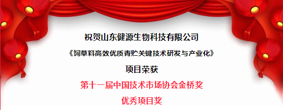 經各省市、部門、各地技術市場協(xié)會(促進會)和有關單位的認真推薦,第十一屆金橋獎評審委員會評審,第十一屆金橋獎組織委員會審定,199 個項目獲優(yōu)秀項目獎,其中山東健源生物科技有限公司《飼草料高效優(yōu)質青貯關鍵技術研發(fā)與產業(yè)化》項目榮獲第十一屆中國技術市場協(xié)會金橋獎優(yōu)秀項目獎。