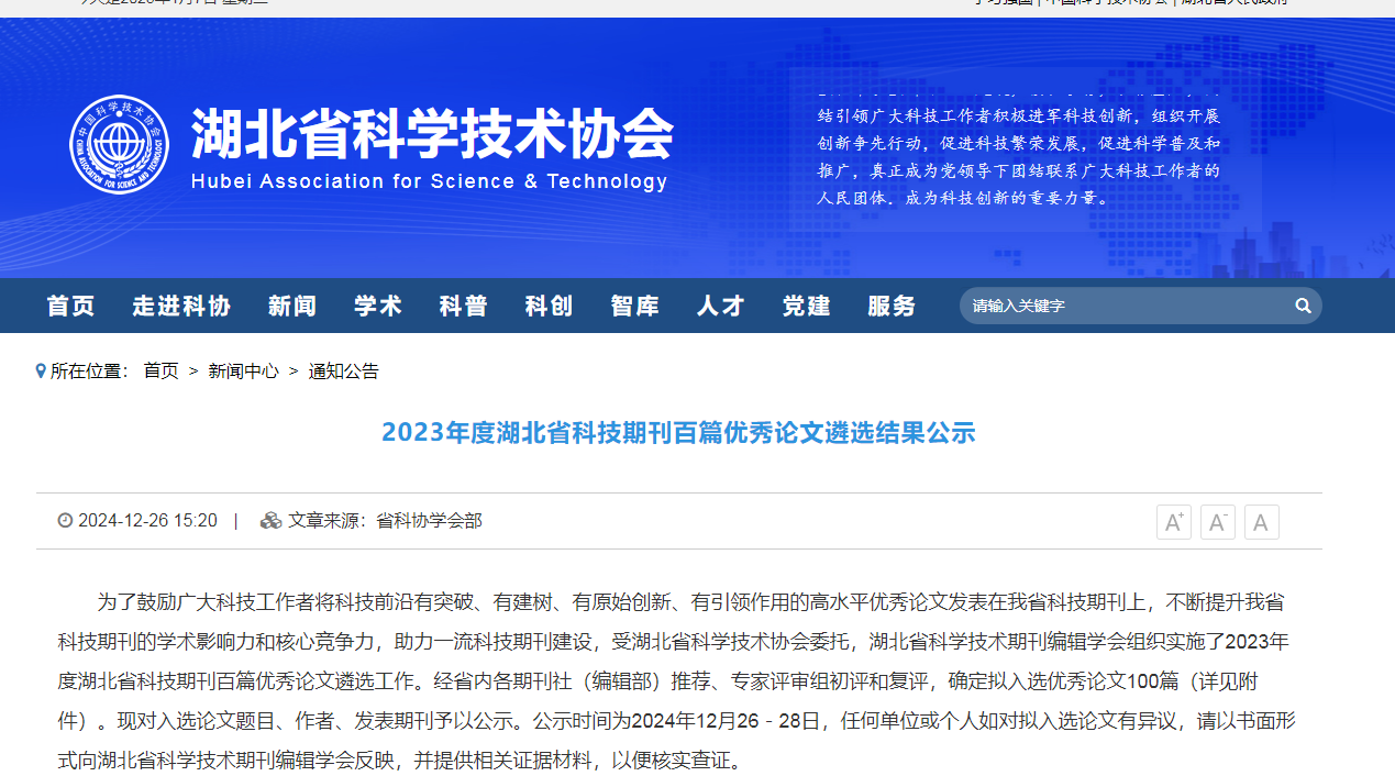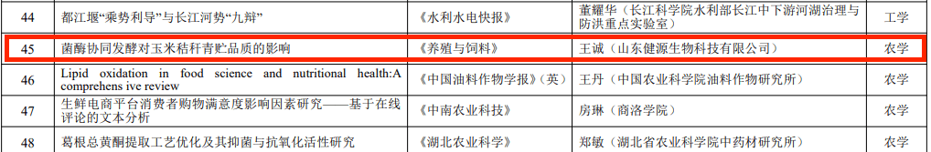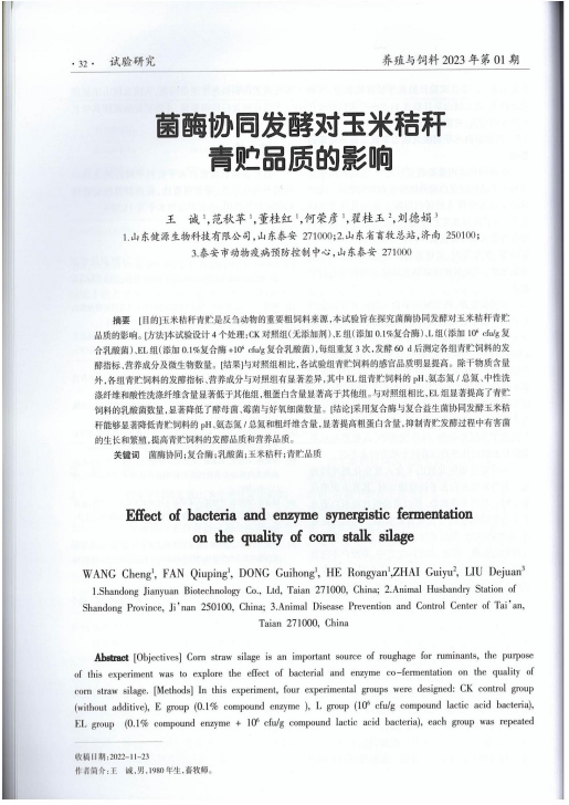發(fā)布時間:[2025-1-15 17:6:25] 瀏覽量:2794次2024年12月31日,由湖北省科學(xué)技術(shù)協(xié)會指導(dǎo),湖北省科學(xué)技術(shù)期刊編輯學(xué)會組織實(shí)施的2023年度湖北省科技期刊百篇優(yōu)秀論文遴選結(jié)果公布,經(jīng)過評選,山東健源生物科技有限公司董事長王誠帶領(lǐng)研發(fā)團(tuán)隊(duì)撰寫的《菌酶協(xié)同發(fā)酵對玉米秸稈青貯品質(zhì)的影響》論文入選2023年度湖北省科技期刊百篇優(yōu)秀論文。